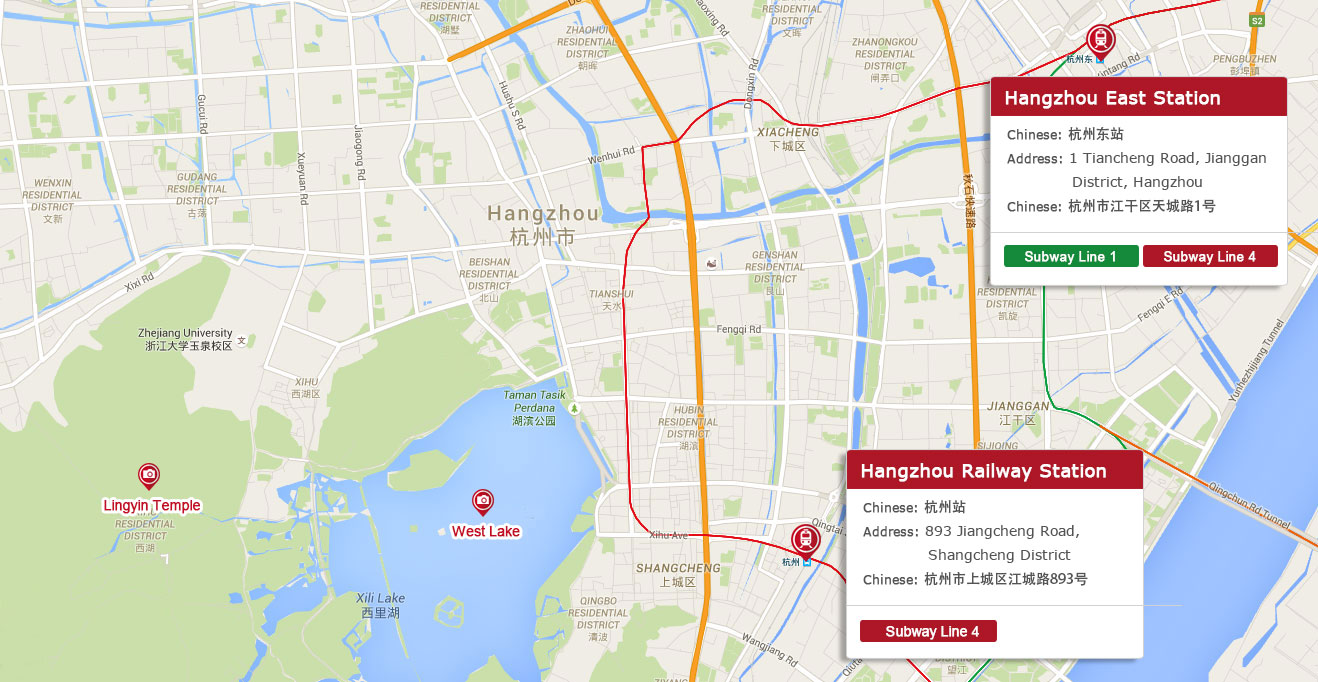 - Metro: Take subway line 1 direct to Hangzhou East Railway Station (8 stops, 25 minutes, 4 RMB).