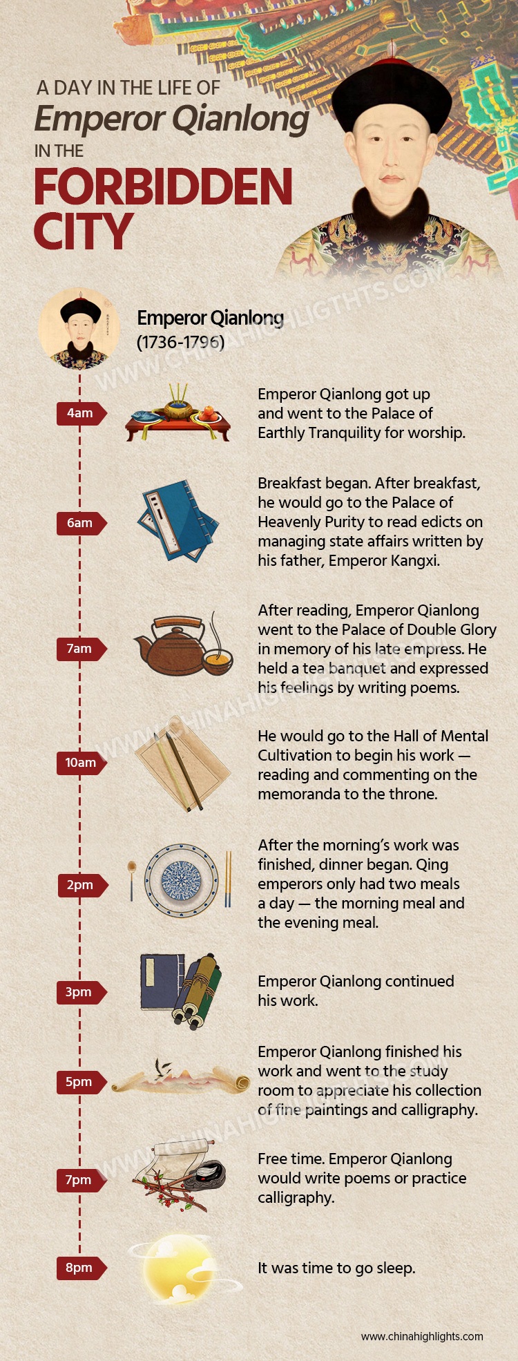- The emperors' routine in the Forbidden City was very regular. They usually got up at 4 a.m. and went to bed at 8 p.m. See A Day in the Life of Emperor Qianlong in the Forbidden City.