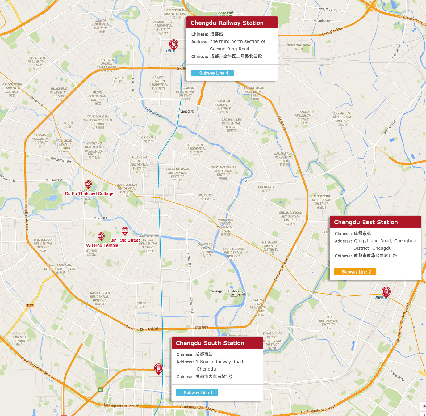 Chengdu South Railway Station is located in Wuhou District. To get there, you can take Metro Line 2 (towards Xipu), and change to Line 1at Tianfu Square (天府广场) and then to Chengdu South Railway Station. It is a 50-minute journey.